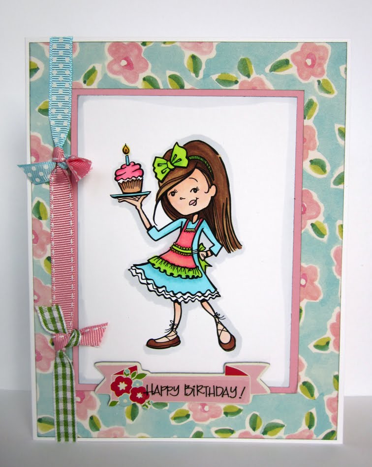 This is the card I made, using a digi stamp from Tickled Pink. I think I'm finally figuring out the best way to color images destined for cards....pick the papers I want to use first, including the embellishments and then color the image to match that. I know, duh, for most of you, but it took me a bit to finally have the light go on!