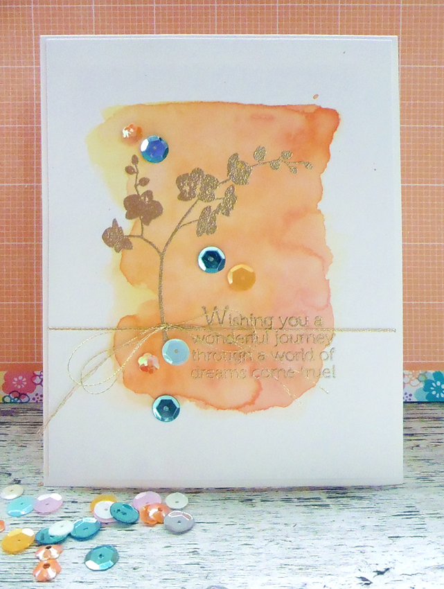 This is a technique I seem to be particularly fond of. If my to-post box (where I found all of these) is any indication. The smooshed watercolor background with a stamp or die cut on top.