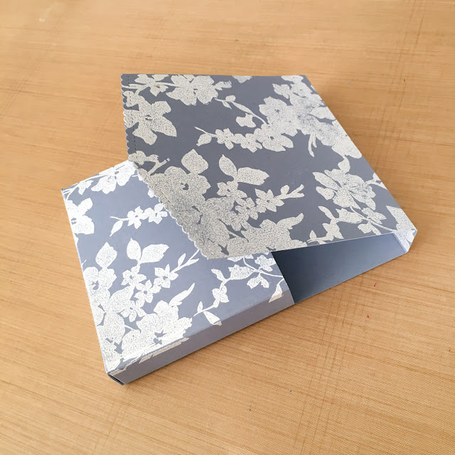 More cards made with the same stamp, but using Simon Says Stone grey ink and several layers of ink. For this box I made the flap with grey card stock and used some patterned paper for the box part. It's not as sturdy as the card stock ones, but quite adequate to hold 4-6 cards and envelopes.